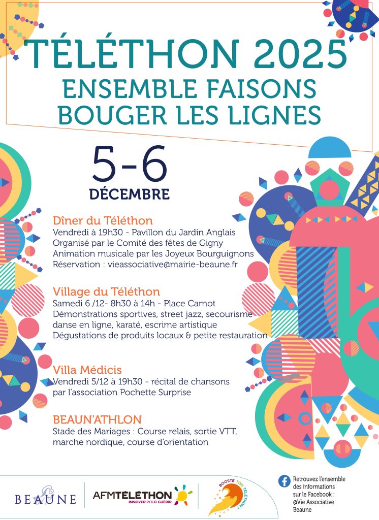 Les 5 et 6 décembre 2025, la Ville de Beaune s’associe de nouveau à une vingtaine d’associations locales pour soutenir le Téléthon. Deux jours de solidarité, d’animations festives et de défis sportifs attendent les habitants, avec un seul objectif : faire bouger les lignes pour la recherche et les familles concernées par les maladies neuromusculaires.
